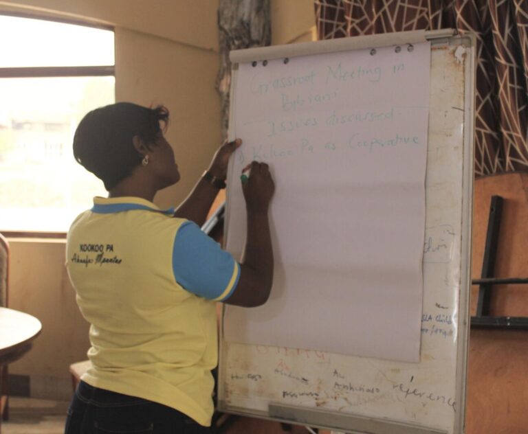 Kokoo Pa has been supported with tree seedlings and has distributed quantities of desirable shade trees seedlings for cocoa. The challenge however, is that most farmers are still unaware of tree registration policy that leads to tree ownership. Therefore, the one-day grassroot meeting organized in Bibiani and Adansi south districts to educate and sensitize Kokoo Pa members on the tree tenure policy and registration process, importance and benefits of tree registration to motivate them to take good care of their planted tree seedlings and address questions bothering them in this area. And also sensitize members on the cooperative concept, reasons why Kokoo Pa is transitioning into cooperative union and its benefits, and to emphasize on the need to adopt good sanitation practices like handwashing, proper waste management, and safe water use to improve their health, productivity, and farm yields.